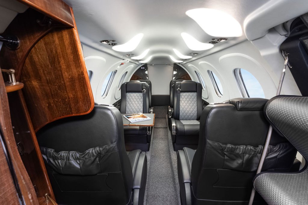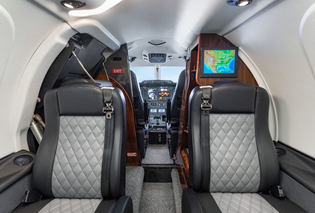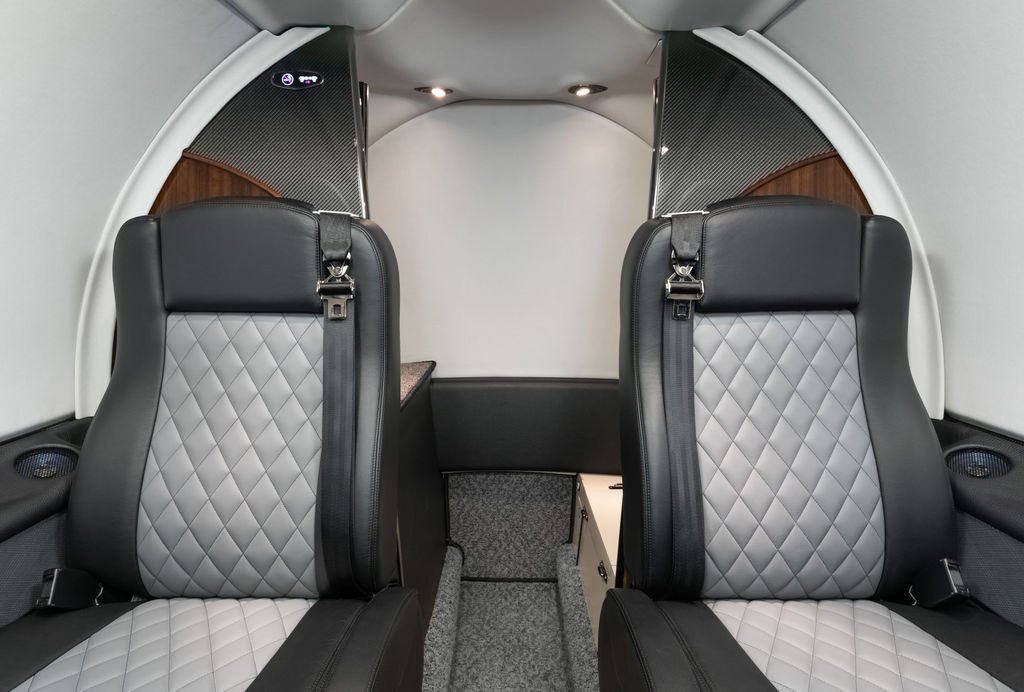The cabin is finished in medium Mahogany veneer with chrome-plated hardware, carbon fiber upper forward and aft bulkheads enclosed window shades, a fully enclosed aft lavatory, and forward pocket doors for cockpit privacy.